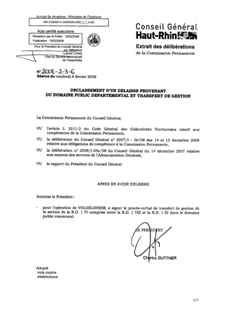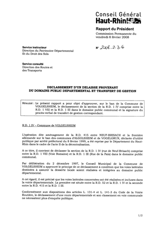 Le présent rapport a pour objet d’approuver, sur le ban de la Commune de VOLGELSHEIM, le déclassement de la section de la R.D. 1 IV comprise entre la R.D. 1 VIII et la R.D. 1 III dans le domaine public communal et la signature du procès-verbal de transfert de gestion correspondant.