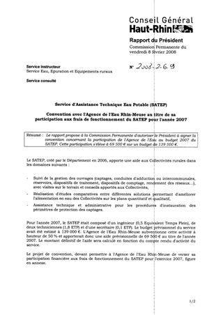 Le rapport propose à la Commission Permanente d'autoriser le Président à signer la convention concernant la participation de l'Agence de l'Eau au budget 2007 du SATEP. Cette participation s'élève à 69 500 € sur un budget de 139 500 €.