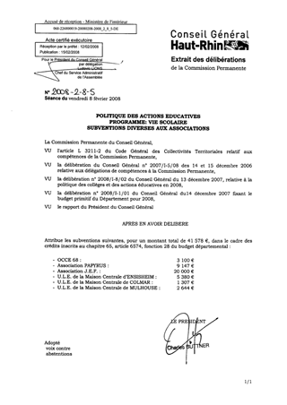 Dans le cadre du BP 2008, le Conseil Général a donné délégation à la Commission Permanente pour l’affectation des subventions liées à la vie scolaire. Le présent rapport concerne l’association départementale de l’Office Central de Coopération à l’Ecole, l’association PAPYRUS, l’association « Jeunes, Emploi, Formation », les associations de gestion de la scolarisation des détenus dans les établissements pénitentiaires du Haut-Rhin. Le montant total des subventions proposées s’élève à 41 578 €.
