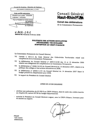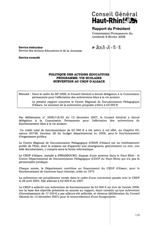 Dans le cadre du BP 2008, le Conseil Général a donné délégation à la Commission permanente pour l'affectation des subventions liées à la vie scolaire. Le présent rapport concerne le Centre Régional de Documentation Pédagogique d'Alsace. Le montant de la subvention proposée s'élève à 63 000 €