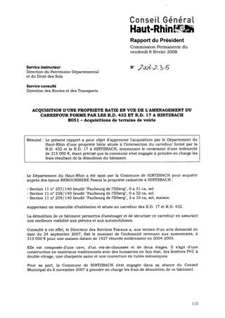 Le présent rapport a pour objet d'approuver l'acquisition par le Département du Haut-Rhin d’une propriété bâtie située à l’intersection du carrefour formé par la R.D. 432 et la R.D. 17 à HIRTZBACH, moyennant le versement d'une indemnité de 315 000 €, étant précisé que la commune s’est engagée à prendre en charge les frais résultant de la démolition du bâtiment.