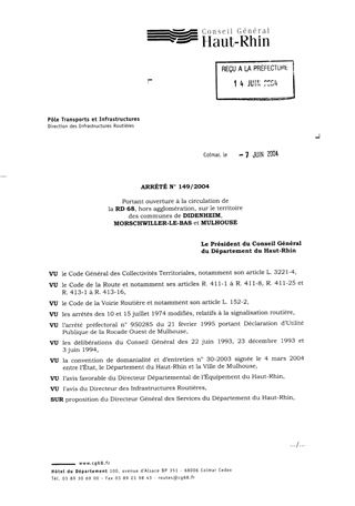 Portant ouverture à la circulation de la RD 68, hors agglomération, sur le territoire des communes de DIDENHEIM, MORSCHWILLER-LE-BAS et MULHOUSE Resumé Pièces jointes ARRETE Assemblée : Non défini Date : 07/06/2004 Rapporteur : Non défini Collectivité : Conseil départemental du Haut-Rhin Direction : Non défini Service : Direction des Routes Domaine : Circulation Commission :