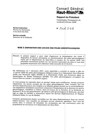 le présent rapport a pour objet d’approuver la formalisation des mises à disposition de locaux nécessaires au fonctionnement des pôles gérontologiques repris par le Département du Haut-Rhin à compter du 1er janvier 2008. Les premières conventions portant sur ces services concernent six sites et vous sont proposées moyennant une redevance totale annuelle de 6 018,40 €.