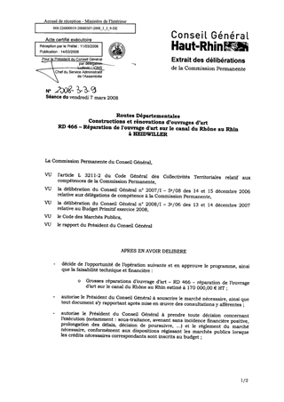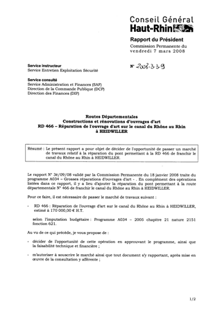 Le présent rapport a pour objet de décider de l'opportunité de passer un marché de travaux relatif à la réparation du pont permettant à la RD 466 de franchir le canal du Rhône au Rhin à HEIDWILLER.