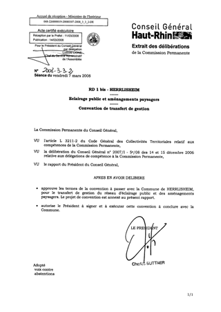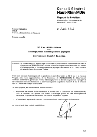 Le présent rapport a pour objet d'autoriser la conclusion d’une convention avec la Commune de HERRLISHEIM, afin de lui confier la gestion et l’entretien du réseau d’éclairage public et des aménagements paysagers situés sur la RD 1 bis, au droit du giratoire avec la rue des Vosges.
