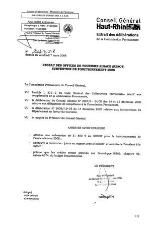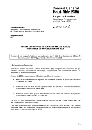 Réseau des offices de tourisme Alsace (RESOT) - Subvention de fonctionnement 2008.