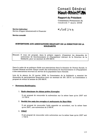 Il vous est proposé, dans le présent rapport, d’examiner les demandes de subvention de fonctionnement et d’équipement relevant de la Direction de la Solidarité, pour un montant de 290 880 €.
