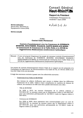 Contrat cadre pluriannuel. Contrat d'assainissement avec les communes de GUNSBACH, MUNSTER, SOULTZEREN, WALBACH, STE MARIE AUX MINES, la Communauté de Communes de la Vallée Noble et le SIVOM de l'agglomération mulhousienne (renforcement hydraulique).