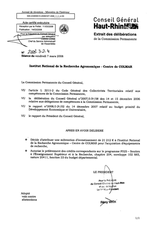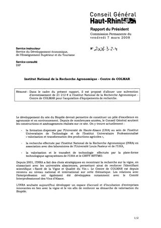 Dans le cadre du présent rapport, il est proposé d'allouer une subvention d'investissement de 21 212 € à l'Institut National de la Recherche Agronomique - Centre de COLMAR pour l'acquisition d’équipements de recherche.