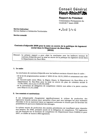 Le présent rapport a pour objet la conclusion avec les bailleurs sociaux de contrats d’objectifs pour la mise en œuvre de la politique du logement social dans le Département du Haut-Rhin