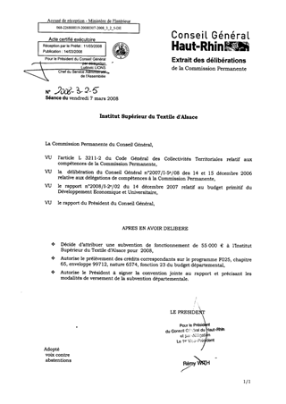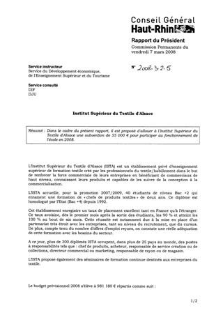 Dans le cadre du présent rapport, il est proposé d'allouer à l'Institut Supérieur du Textile d'Alsace une subvention de 55 000 € pour participer au fonctionnement de l'école en 2008.