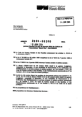Portant fixation du prix de journée 2004 du CARAJ de l'Association "Marie Pire" d'ALTKIRCH Resumé Pièces jointes ARRETE Assemblée : Non défini Date : 08/06/2004 Rapporteur : Non défini Collectivité : Conseil départemental du Haut-Rhin Direction : Non défini Service : Service de la Tarification des Etablissements Domaine : Prix de Journée Commission :