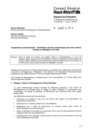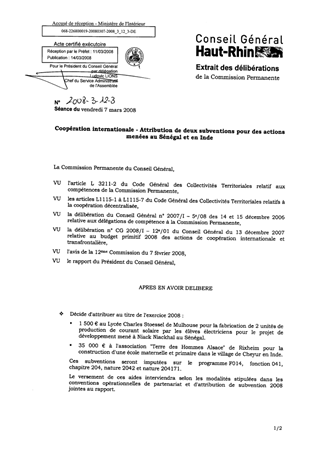 Dans le cadre du soutien aux projets d'aide au développement, il vous est proposé, après examen de la Commission Actions et Relations Internationales du 7 février 2008, d'attribuer deux subventions départementales pour un montant de 36 500 € pour deux actions menées au Sénégal et en Inde.