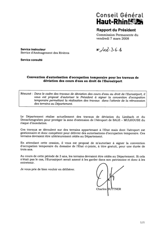 Dans le cadre des travaux de déviation des cours d'eau au droit de l'Euroairport, il vous est proposé d'autoriser le Président à signer la convention d'occupation temporaire permettant la réalisation des travaux dans l'attente de la rétrocession des terrains au Département.