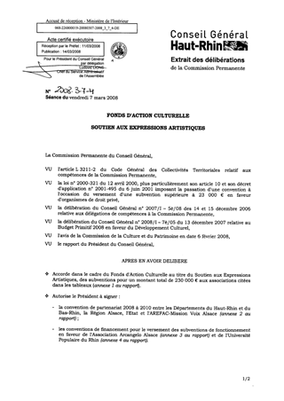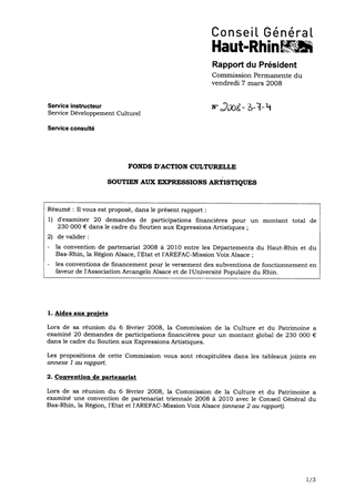 Il vous est proposé, dans le présent rapport : 1) d'examiner 20 demandes de participations financières pour un montant total de 230 000 € dans le cadre du Soutien aux Expressions Artistiques ; 2) de valider : - la convention de partenariat 2008 à 2010 entre les Départements du Haut-Rhin et du Bas-Rhin, la Région Alsace, l'Etat et l'AREFAC-Mission Voix Alsace ; - les conventions de financement pour le versement des subventions de fonctionnement en faveur de l'Association Arcangelo Alsace et de l'Université Populaire du Rhin.