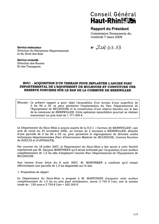 Le présent rapport a pour objet l'acquisition d'un terrain d'une superficie de 3 ha 06 a 02 ca pour permettre l'implantation du Parc Départemental de l'Equipement de MULHOUSE et la constitution d'une réserve foncière sur le ban de la commune de BERRWILLER. Cette opération immobilière pourrait se réaliser moyennant un prix total de 1 171 000 €.