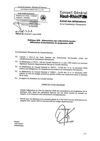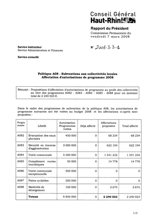 Politique A08 - Subventions aux collectivités locales - Affectation d'autorisations de programme 2008.