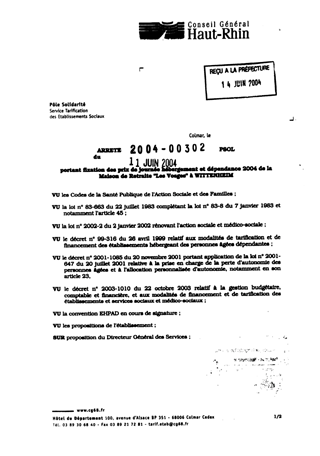 Portant fixation des prix de journée hébergement et dépendance 2004 de la Maison de Retraite "Les Vosges" à WITTENHEIM Resumé Pièces jointes ARRETE Assemblée : Non défini Date : 11/06/2004 Rapporteur : Non défini Collectivité : Conseil départemental du Haut-Rhin Direction : Non défini Service : Service de la Tarification des Etablissements Domaine : Prix de Journée Commission :