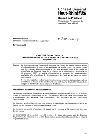 Le fonctionnement de l'abattoir de proximité de Cernay est assuré par une société d'exploitation dans le cadre d'une délégation de service public. Ce contrat prévoit que les travaux d'investissements et de gros entretien sont à la charge du propriétaire de l'abattoir. Lors de la réunion de la Commission consultative du 30 novembre 2007, la société d'exploitation a présenté les investissements souhaités afin d'améliorer le fonctionnement de l'outil et les services rendus aux usagers. Il vous est proposé de réaliser des investissements complémentaires qui permettront d’améliorer le travail et les rendements des opérateurs, de faciliter l’accueil des usagers et de répondre à des exigences de sécurité.