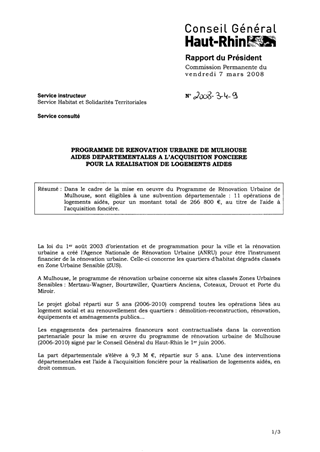 Programme de rénovation urbaine de MULHOUSE. Aides départementales à l'acquisition foncière pour la réalisation de logements aidés.
