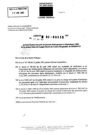 Portant fixation des prix de journée hébergement et dépendance 2002 de la section soins de longue durée du centre hospitalier de Sierentz Resumé Pièces jointes ARRETE Assemblée : Non défini Date : 29/01/2002 Rapporteur : Non défini Collectivité : Conseil départemental du Haut-Rhin Direction : Non défini Service : Service de la Tarification des Etablissements Domaine : Prix de Journée Commission :