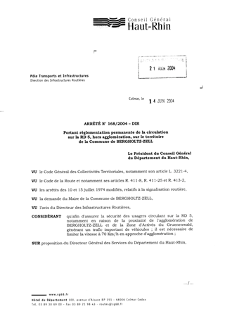 Portant réglementation permanente de la circulation sur la RD 5, hors agglomération, sur le territoire de la commune de BERGHOLTZ-ZELL Resumé Pièces jointes ARRETE Assemblée : Non défini Date : 14/06/2004 Rapporteur : Non défini Collectivité : Conseil départemental du Haut-Rhin Direction : Non défini Service : Direction des Routes Domaine : Circulation Commission :