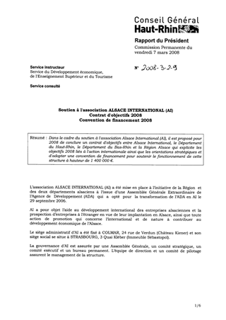 Soutien à l'association Alsace International (AI) - Contrat d'objectifs 2008 - Convention de financement 2008.