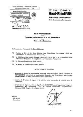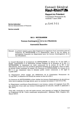 Le présent rapport a pour objet d'approuver la signature d'une convention entre la Commune de WITTELSHEIM et le Département, dans le but de définir la participation financière du Département pour les travaux d'aménagement de la rue d'Ensisheim.