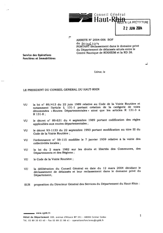 Portant déclassement dans le domaine privé du Département de délaissés situés entre le Centre Nautique de RIXHEIM et la RD 38 Resumé Pièces jointes ARRETE Assemblée : Non défini Date : 21/06/2004 Rapporteur : Non défini Collectivité : Conseil départemental du Haut-Rhin Direction : Non défini Service : Service du Patrimoine et du droit des Sols Domaine : Déclassement de voirie Commission :