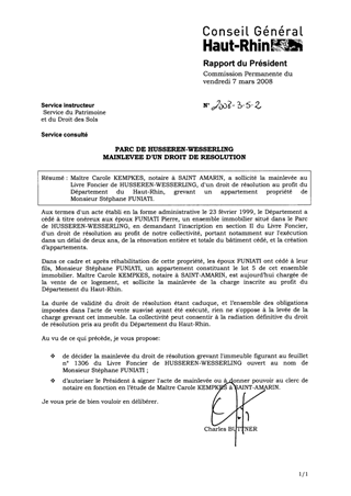 Maître Carole KEMPKES, notaire à SAINT AMARIN, a sollicité la mainlevée au Livre Foncier de HUSSEREN-WESSERLING, d'un droit de résolution au profit du Département du Haut-Rhin, grevant un appartement propriété de Monsieur Stéphane FUNIATI.