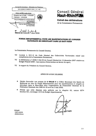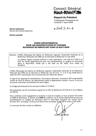 L'Office Municipal des Sports de Mulhouse organise l'Assemblée Générale de la Fédération Nationale des OMS qui se déroulera à Mulhouse en mai 2008. Le présent rapport propose d'allouer à cette association, une aide de 6 000 € au titre du Fonds départemental pour les manifestations et congrès se déroulant dans le Haut-Rhin, fonds qui a été doté au BP 2008, d'un crédit de 38 000 €.