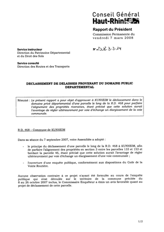 Le présent rapport a pour objet d'approuver à KUNHEIM le déclassement dans le domaine privé départemental d’une parcelle le long de la R.D. 468 pour parfaire l’alignement des propriétés riveraines, étant précisé que cette solution aurait l'avantage de régler ultérieurement par voie d’échange un élargissement de la voie communale.