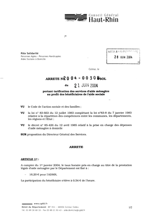 Portant tarification des services d'aide ménagère au profit des bénéficiaires de l'aide sociale Resumé Pièces jointes ARRETE Assemblée : Non défini Date : 21/06/2004 Rapporteur : Non défini Collectivité : Conseil départemental du Haut-Rhin Direction : Non défini Service : Service Aides sociales à domicile Domaine : Personnes Agées Commission :