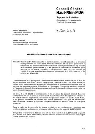 Dans le cadre de la démarche de territorialisation, le renforcement de la présence du Département du HAUT-RHIN dans les Territoires de Vie passe par la mise à disposition des animateurs-coordonnateurs de locaux provisoires afin d’y assurer leurs missions (permanences…). Il est proposé d’approuver la convention pour l’occupation de locaux provisoires à GUEBWILLER pour un loyer annuel de 10 800 €, et des provisions sur charges d’un montant de 3 600 € par an, et de m’autoriser à la signer.