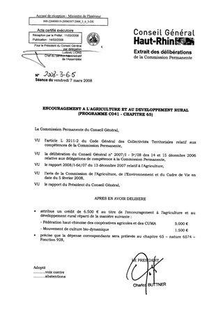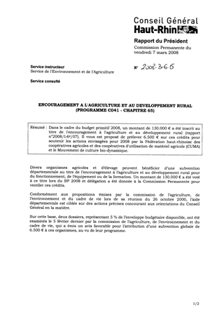 Dans le cadre du budget primitif 2008, un montant de 130.000 € a été inscrit au titre de l'encouragement à l'agriculture et au développement rural (rapport n°2008/I-6è/07). Il vous est proposé de prélever 6.500 € sur ces crédits pour soutenir les actions envisagées pour 2008 par la Fédération haut-rhinoise des coopératives agricoles et des coopératives d'utilisation de matériel agricole (CUMA) et le Mouvement de culture bio-dynamique.