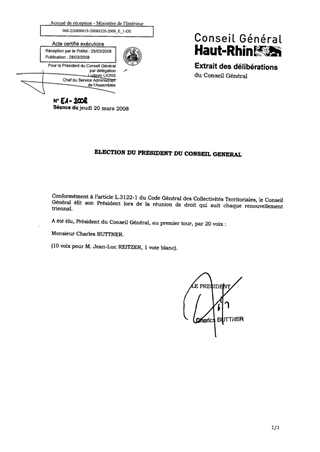 Election du Président du Conseil Général Resumé Le présent rapport a pour objet d’élire le Président du Conseil Général. Pièces jointes DELIBERATION RAPPORT Assemblée : Conseil General Date : 20/03/2008 Rapporteur : Non défini Collectivité : Conseil départemental du Haut-Rhin Direction : Non défini Service : Service Administratif de l'Assemblée Domaine : Administration Commission : Assemblée Départementale