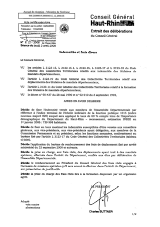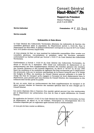 Indemnités et frais divers. Resumé Pièces jointes DELIBERATION RAPPORT Assemblée : Conseil General Date : 03/04/2008 Rapporteur : Non défini Collectivité : Conseil départemental du Haut-Rhin Direction : Non défini Service : Service Administratif de l'Assemblée Domaine : Administration Commission : Assemblée Départementale