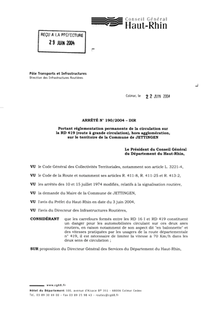 Portant réglementation permanente de la circulation sur la RD 419 (route à grande circulation), hors agglomération, sur le territoire de la Commune de JETTINGEN Resumé Pièces jointes ARRETE Assemblée : Non défini Date : 22/06/2004 Rapporteur : Non défini Collectivité : Conseil départemental du Haut-Rhin Direction : Non défini Service : Direction des Routes Domaine : Circulation Commission :