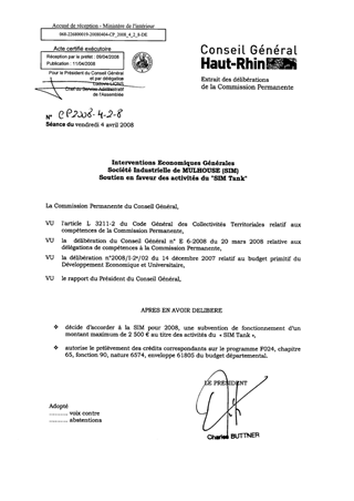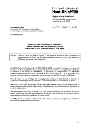 Dans le cadre du présent rapport, il est proposé d'attribuer une subvention de fonctionnement de 2 500 € à la Société Industrielle de MULHOUSE (SIM) au titre de 2008 pour les activités du "SIM Tank".