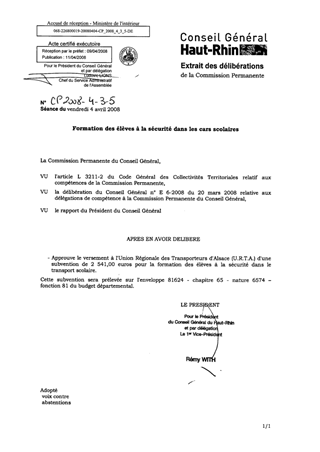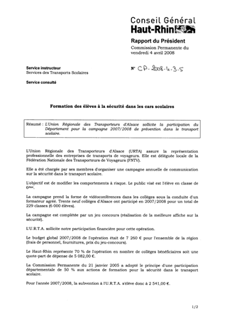 L'Union Régionale des Transporteurs d'Alsace sollicite la participation du Département pour la campagne 2007/2008 de prévention dans le transport scolaire.