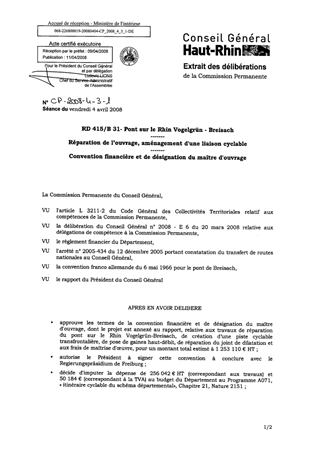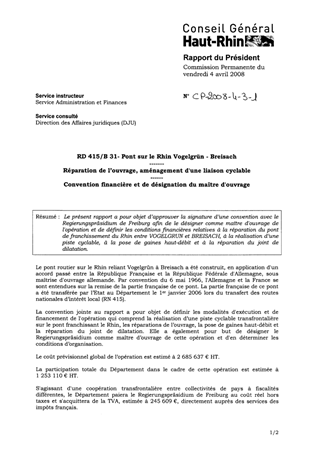 RD 415/B31 Pont sur Rhin Vogelgrun - Breisach Aménagement d'une liaison cyclable transfrontalière réparation de l'ouvrage convention financière et de désignation du maître d'ouvrage