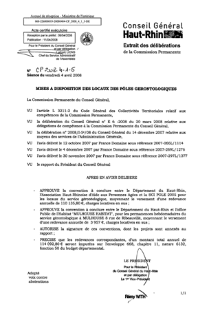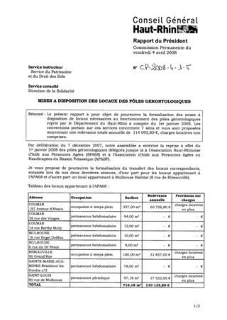 Le présent rapport a pour objet de poursuivre la formalisation des mises à disposition de locaux nécessaires au fonctionnement des pôles gérontologiques repris par le Département du Haut-Rhin à compter du 1er janvier 2008. Les conventions portant sur ces services concernent 7 sites et vous sont proposées moyennant une redevance totale annuelle de 114 092,80 €, charges locatives non comprises.