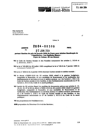 Portant fixation du prix de journée 2004 du Foyer pour Adultes Handicapés de l'association "Les Papillons Blancs" Foyer de Colmar, 30 rue Henner Resumé Pièces jointes ARRETE Assemblée : Non défini Date : 22/06/2004 Rapporteur : Non défini Collectivité : Conseil départemental du Haut-Rhin Direction : Non défini Service : Service de la Tarification des Etablissements Domaine : Prix de Journée Commission :