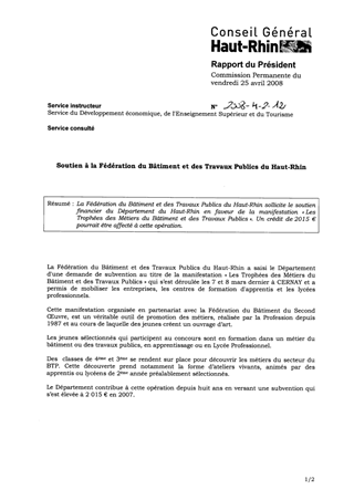 La Fédération du Bâtiment et des Travaux Publics du Haut-Rhin sollicite le soutien financier du Département du Haut-Rhin en faveur de la manifestation « Les Trophées des Métiers du Bâtiment et des Travaux Publics ». Un crédit de 2015 € pourrait être affecté à cette opération.