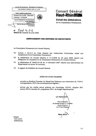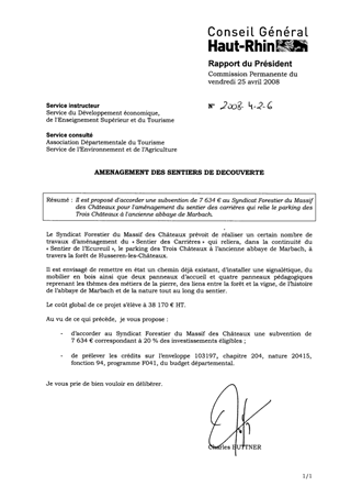 Il est proposé d'accorder une subvention de 7 634 € au Syndicat Forestier du Massif des Châteaux pour l'aménagement du sentier des carrières qui relie le parking des Trois Châteaux à l'ancienne abbaye de Marbach.