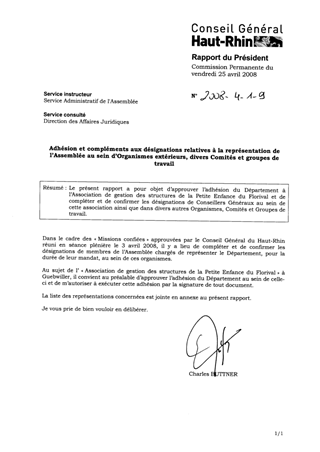 Le présent rapport a pour objet d’approuver l’adhésion du Département à l’Association de gestion des structures de la Petite Enfance du Florival et de compléter et de confirmer les désignations de Conseillers Généraux au sein de cette association ainsi que dans divers autres Organismes, Comités et Groupes de travail.