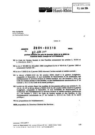 Portant fixation du prix de journée 2004 de la MRS de l'Institut Saint Joseph de LUTTERBACH Resumé Pièces jointes ARRETE Assemblée : Non défini Date : 22/06/2004 Rapporteur : Non défini Collectivité : Conseil départemental du Haut-Rhin Direction : Non défini Service : Service de la Tarification des Etablissements Domaine : Prix de Journée Commission :