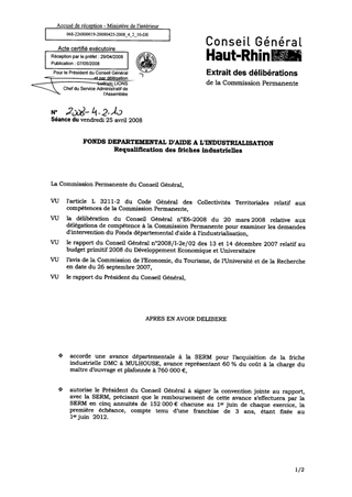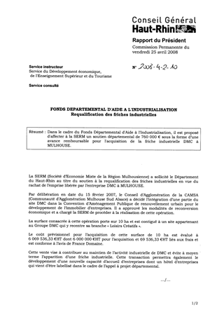 Dans le cadre du Fonds Départemental d'Aide à l'Industrialisation, il est proposé d'affecter à la SERM un soutien départemental de 760 000 € sous la forme d’une avance remboursable pour l'acquisition de la friche industrielle DMC à MULHOUSE.