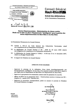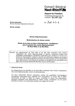 Les Départements du Haut Rhin et du Bas Rhin souhaitent faire évoluer l'exploitation des routes départementales et désirent notamment profiter des possibilités technologiques actuellement disponibles pour améliorer le recueil et le traitement d'informations routières et donner une information adaptée aux usagers de la route. Une étude prospective commune est ainsi proposée sur les réseaux des deux départements. Il est proposé de constituer un groupement de commandes à cet effet, avec le Conseil Général du Bas Rhin comme coordonnateur.