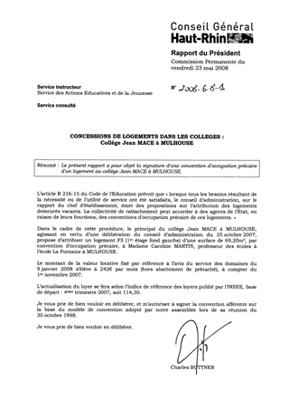 Le présent rapport a pour objet la signature d'une convention d'occupation précaire d'un logement au collège Jean MACE à MULHOUSE.